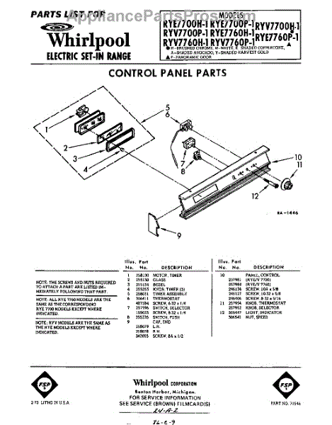 Parts for Whirlpool RYE7760W1: 01 - Control Panel Parts