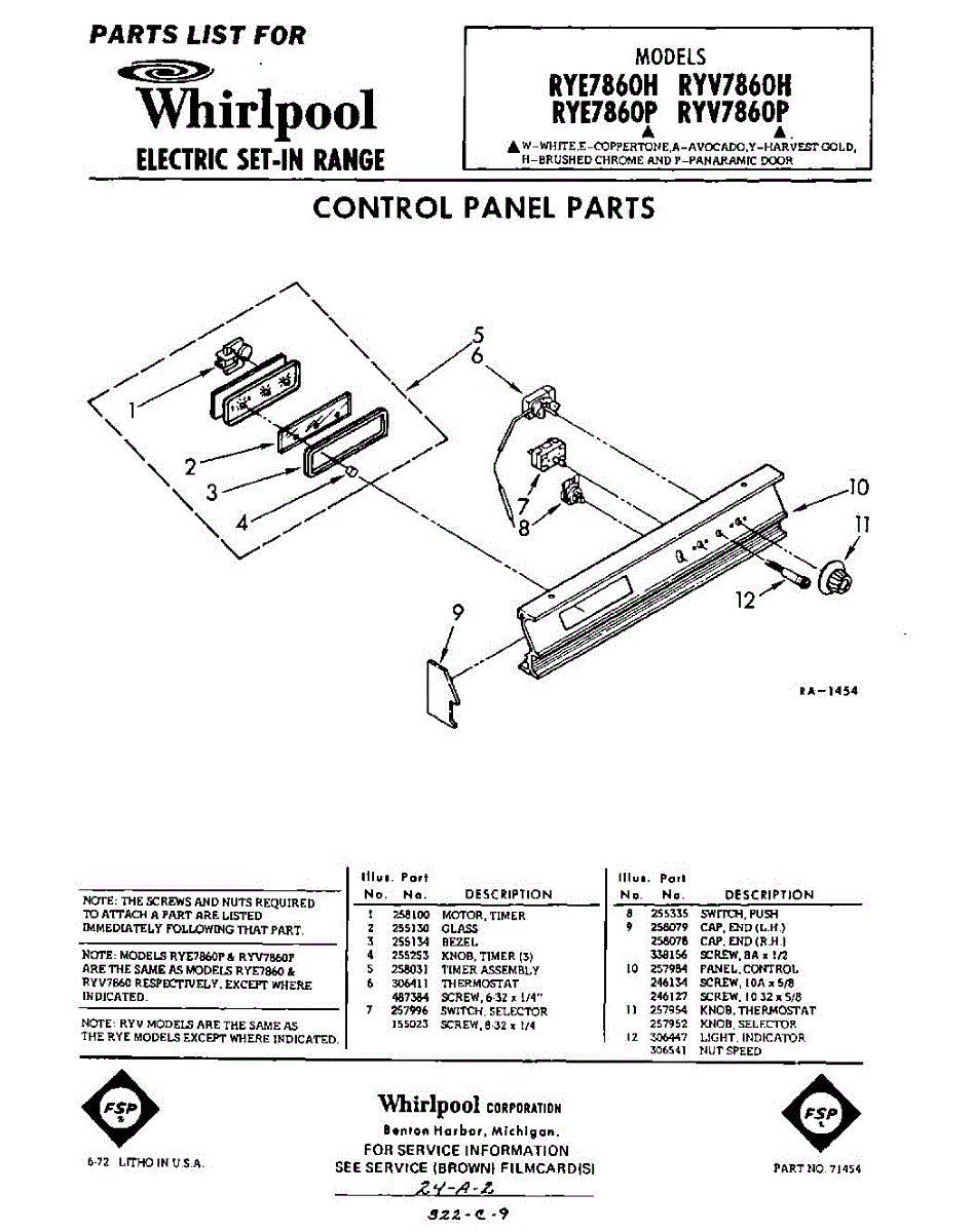 Parts for Whirlpool RYV7860H: 01 - Control Panel Parts
