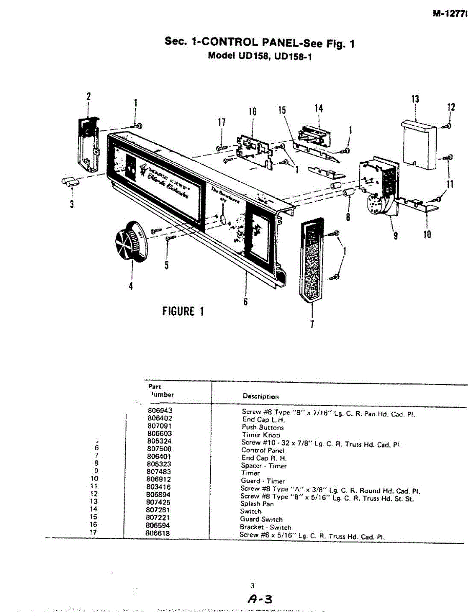 Parts for Magic Chef UD158: 01 - Control Panel (Ud158) Parts