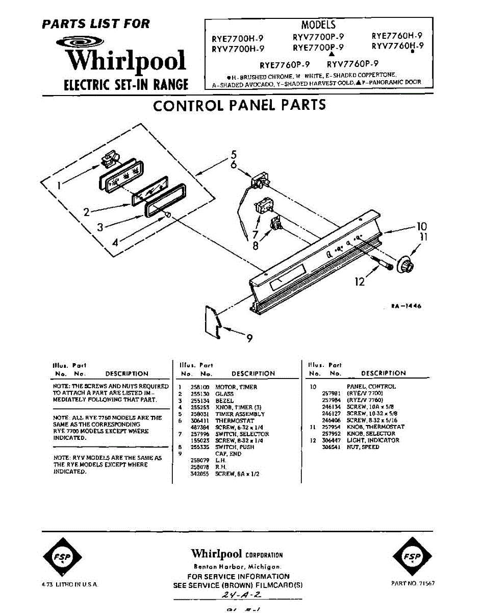 Parts for Whirlpool RYV7760P9: 01 - Control Parts