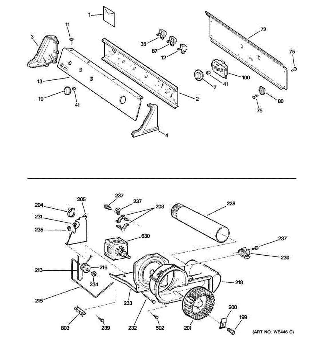 The Blower Wheel is an OEM replacement part for GE dryers. It has a role in the air circulation within the dryer, aiding in the even and efficient drying of clothes. The blower wheel, connected to the motor, helps in expelling the moist air out of the dryer through the exhaust vent during the drying cycle. Causes of a malfunctioning blower wheel are typically wear and tear from regular use, the accumulation of lint or debris, or damage to the wheel’s fins or central hub, which can impact its rotation and air circulation capability. Symptoms of a bad Blower Wheel include: