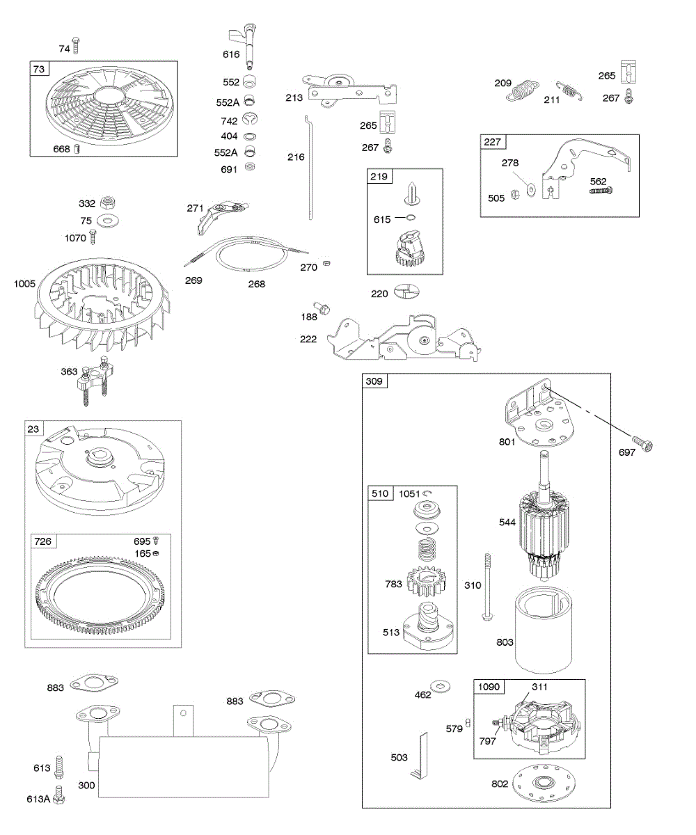 Parts for Briggs & Stratton 405777-0136-E1: Controls, Electric Starter, Exhaust System, Flywheel, Governor Spring Parts