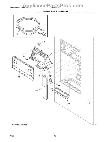 The Dispenser Control Board is an OEM replacement part for Frigidaire refrigerators. This component manages the operation of the ice and water dispenser, controlling functions like dispensing ice, water, and the corresponding display settings. It ensures that the dispenser operates correctly by communicating with other components, such as the ice maker and water valve.