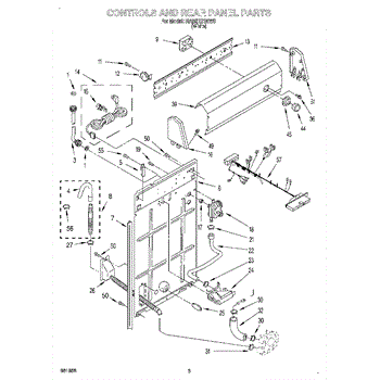 Structural bracket that secures the rear panel to the washer chassis. Replace if cracked, broken, or missing to restore proper alignment and cabinet stability.