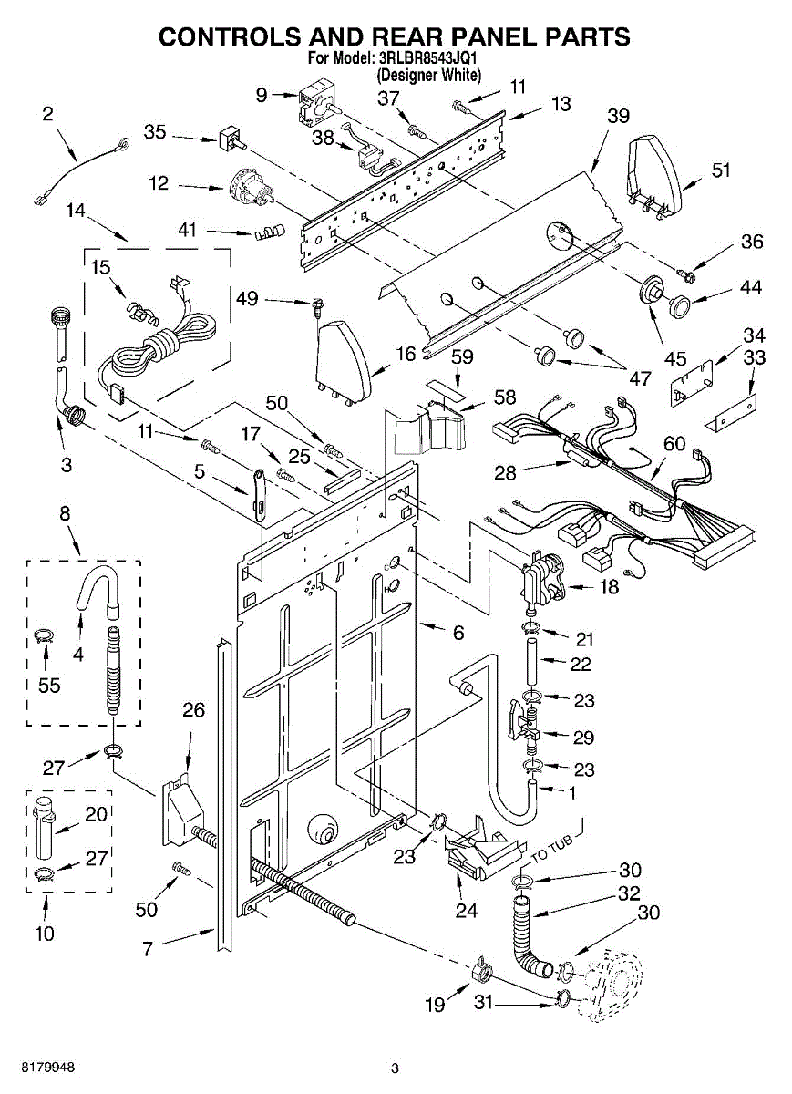Internal drain hose assembly routes water from washer tub to drain pump. Replace if cracked, split, leaking, or connector is broken or damaged.