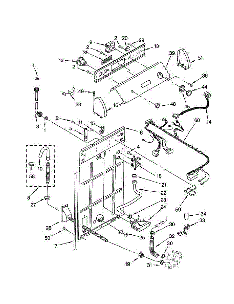 Internal drain hose assembly routes water from washer tub to drain pump. Replace if cracked, split, leaking, or connector is broken or damaged.