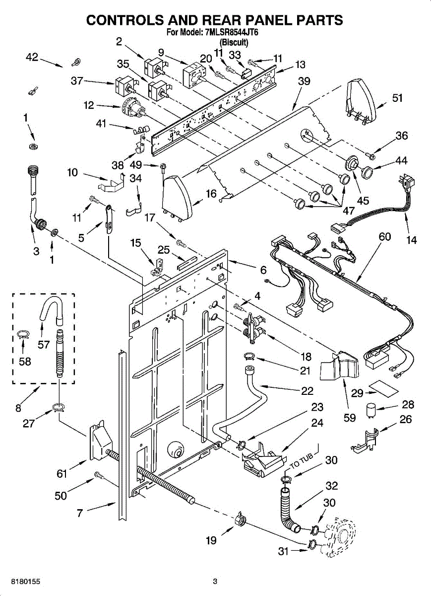 Internal drain hose assembly routes water from washer tub to drain pump. Replace if cracked, split, leaking, or connector is broken or damaged.
