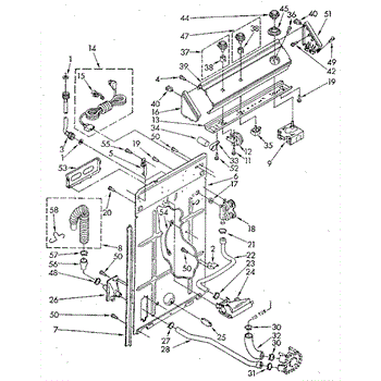 Structural bracket that secures the rear panel to the washer chassis. Replace if cracked, broken, or missing to restore proper alignment and cabinet stability.