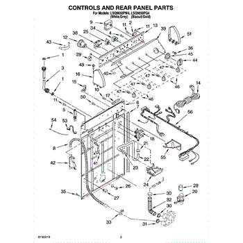 Insulation pad that cushions and protects the washer's rear cabinet panel. Replace if cracked, compressed, or missing to reduce vibration and noise.