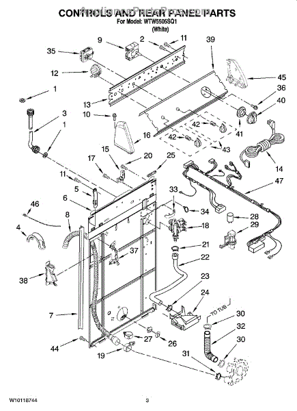 The Drain Hose is an OEM part for Whirlpool washing machines. It is responsible for directing and carrying away water that is pumped out of the washer tub during drain cycles. The drain hose connects from the bottom of the washtub to the household plumbing or out the back of the machine. This washer drain hose includes the retaining clips to hold in place. Causes of a bad drain hose can include mineral deposits from hard water building up inside the hose, cracking from flexing during use, rodent damage, or general degradation from years of service. Symptoms of a faulty drain hose include:
