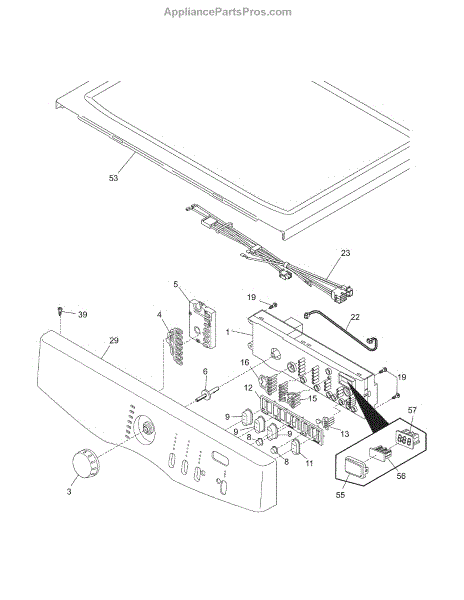 This replacement control panel restores the appliance's front console and user interface so buttons and the display work reliably. It provides the visible face and mounting surface for controls and status indicators. What it does: