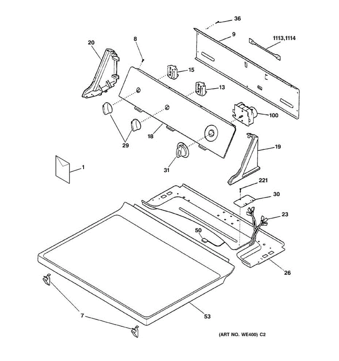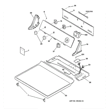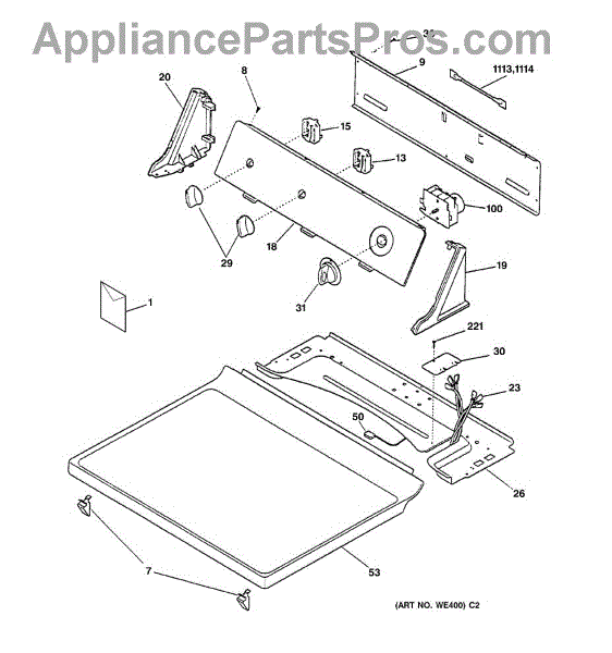 Control knob and clip assembly for dryer or washer. Attaches to control shaft to set cycles and settings. Replace if cracked, broken, or missing.
