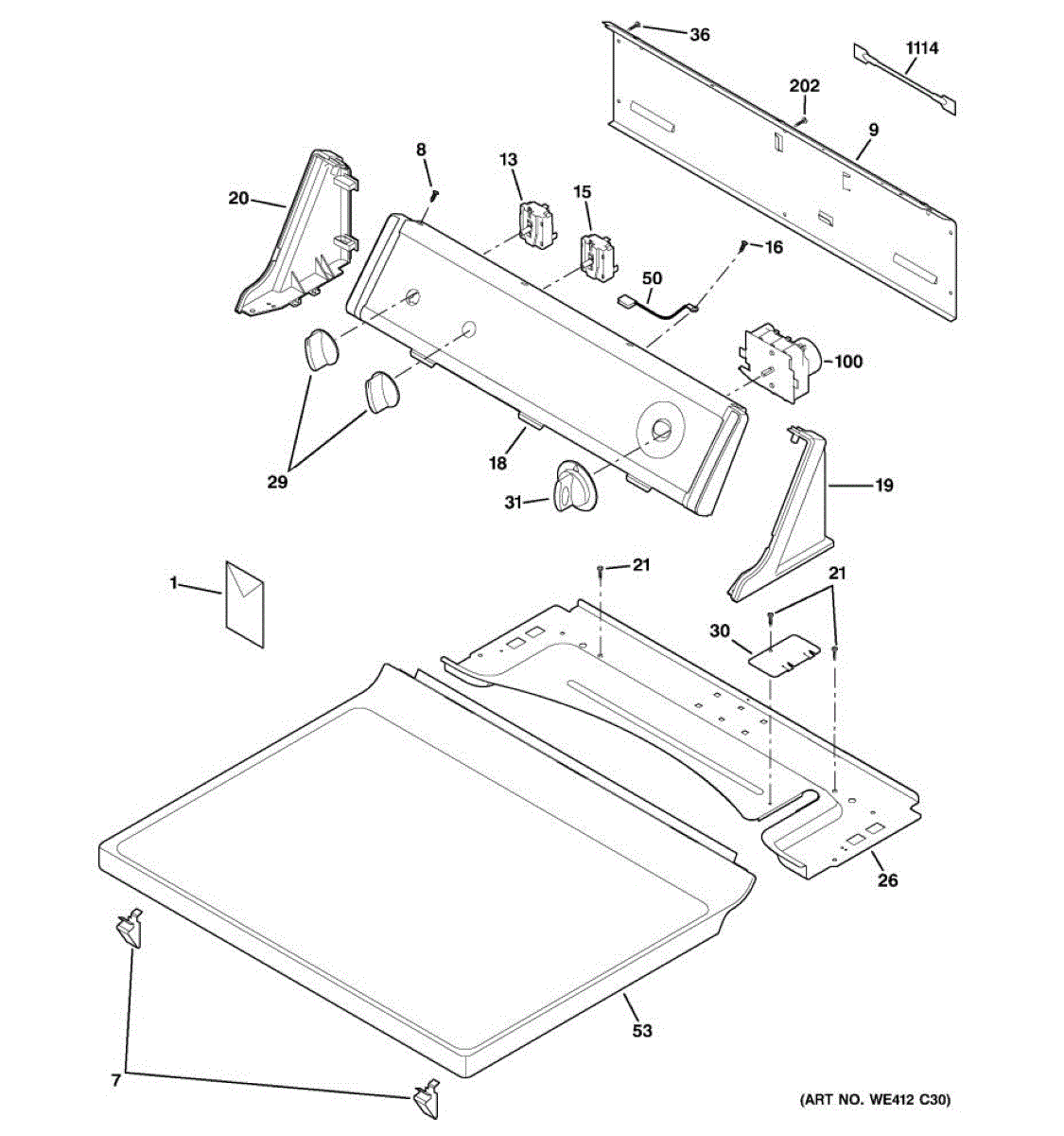 This top panel replaces the outer cover above the cooktop control area to restore the appliance's finished appearance and protect internal components from spills and heat. It fits into the appliance's front top assembly for a secure finish. What it does: