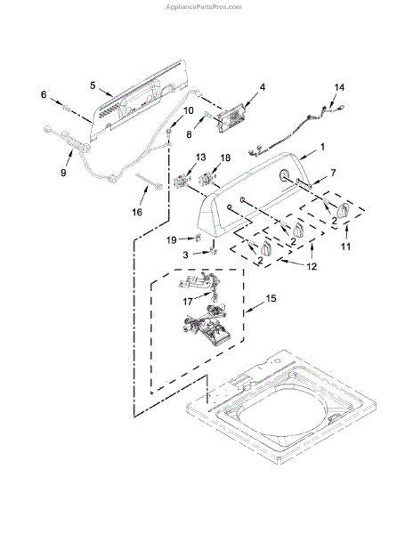 This control panel is the electronic user interface that lets you select cycles and settings and shows status information. It restores responsive touch/button control and visible feedback for the appliance. What it does: