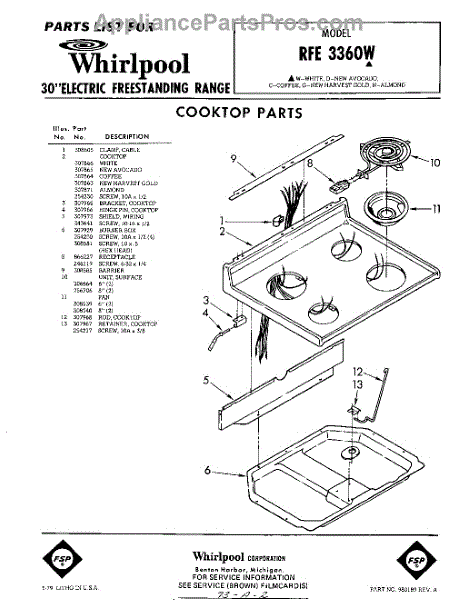 Parts for Whirlpool RFE3360W: 01 - Cook Top Parts