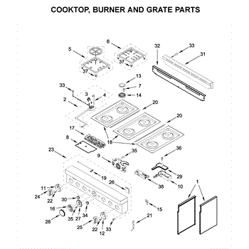 This cooktop top surface assembly provides the finished cooking surface and mounting for burners and controls, restoring the look and function of the appliance. It's the exterior top panel that supports the cooktop components and contains cutouts for burners and control interfaces. What it does