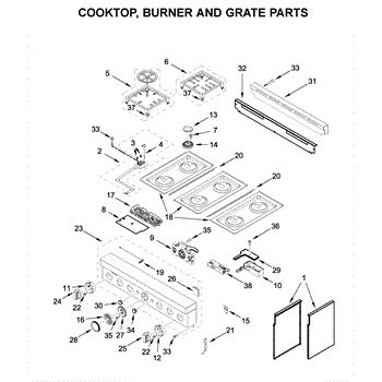 This cooktop top surface assembly provides the finished cooking surface and mounting for burners and controls, restoring the look and function of the appliance. It's the exterior top panel that supports the cooktop components and contains cutouts for burners and control interfaces. What it does
