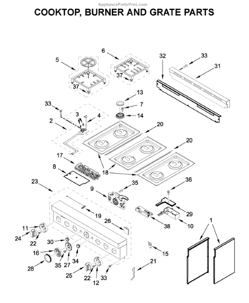 This cooktop top surface assembly provides the finished cooking surface and mounting for burners and controls, restoring the look and function of the appliance. It's the exterior top panel that supports the cooktop components and contains cutouts for burners and control interfaces. What it does