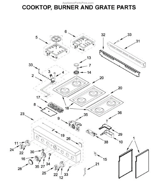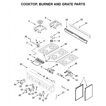 This cooktop top surface assembly provides the finished cooking surface and mounting for burners and controls, restoring the look and function of the appliance. It's the exterior top panel that supports the cooktop components and contains cutouts for burners and control interfaces. What it does