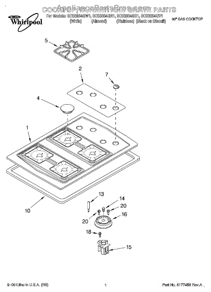 Parts for Whirlpool SCS3004GS1: 01 - Cooktop, Burner And Grate Parts