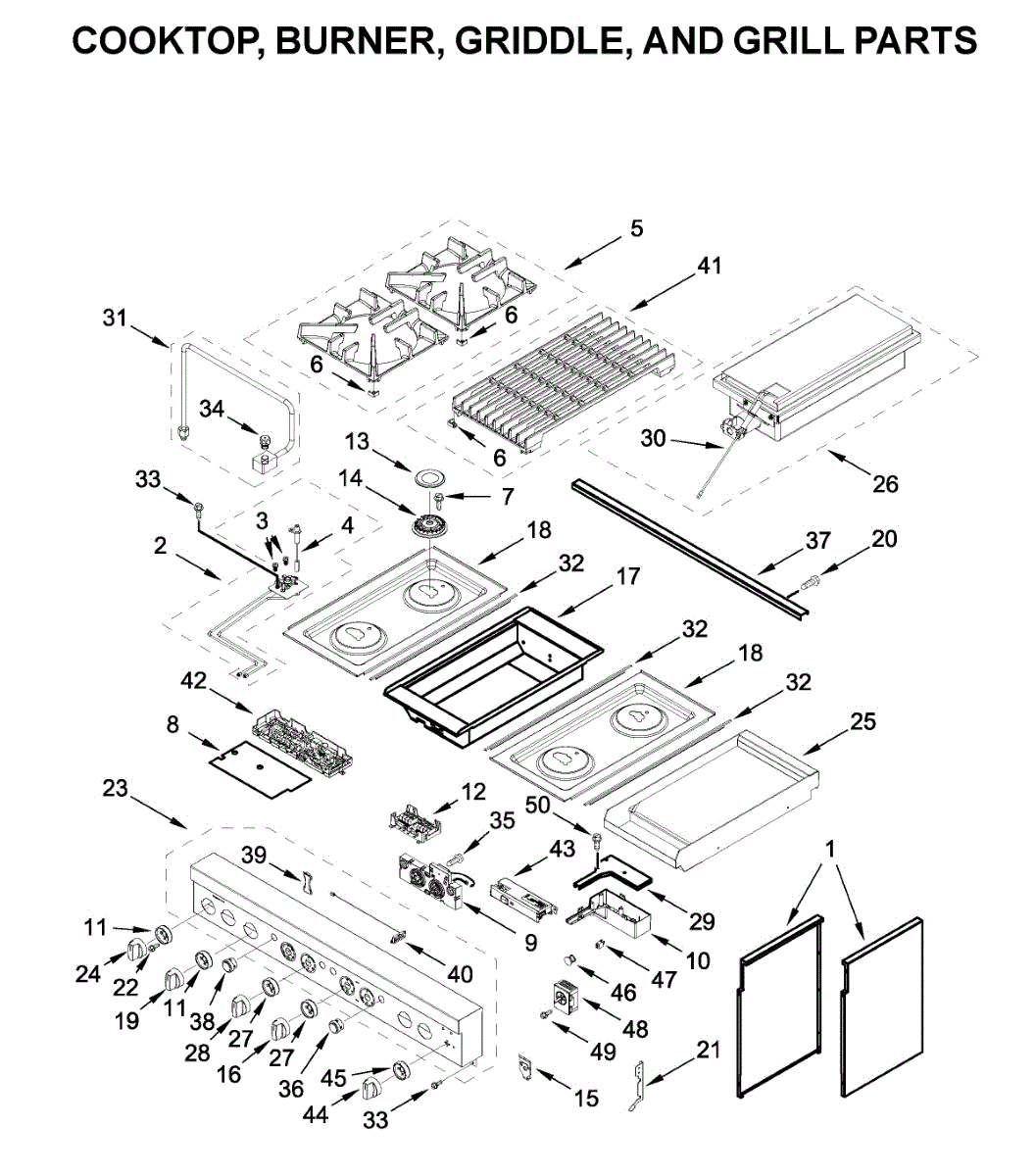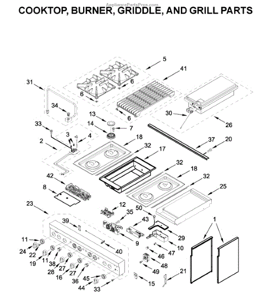 Causes related to normal wear over extended use, exposure to cleaning chemicals, or damage from heavy pans accidentally sliding off grates.