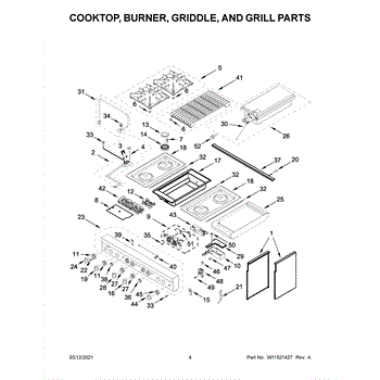 The Grate Pad is an OEM component for Whirlpool gas and electric ranges. Located underneath grates atop burner assemblies, this insulating pad protects the cooktop surface during use.