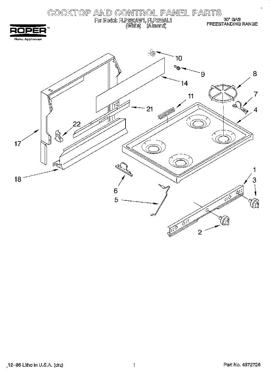 Parts for Roper FLP320AW1: 01 - Cooktop And Control Panel, Literature Parts
