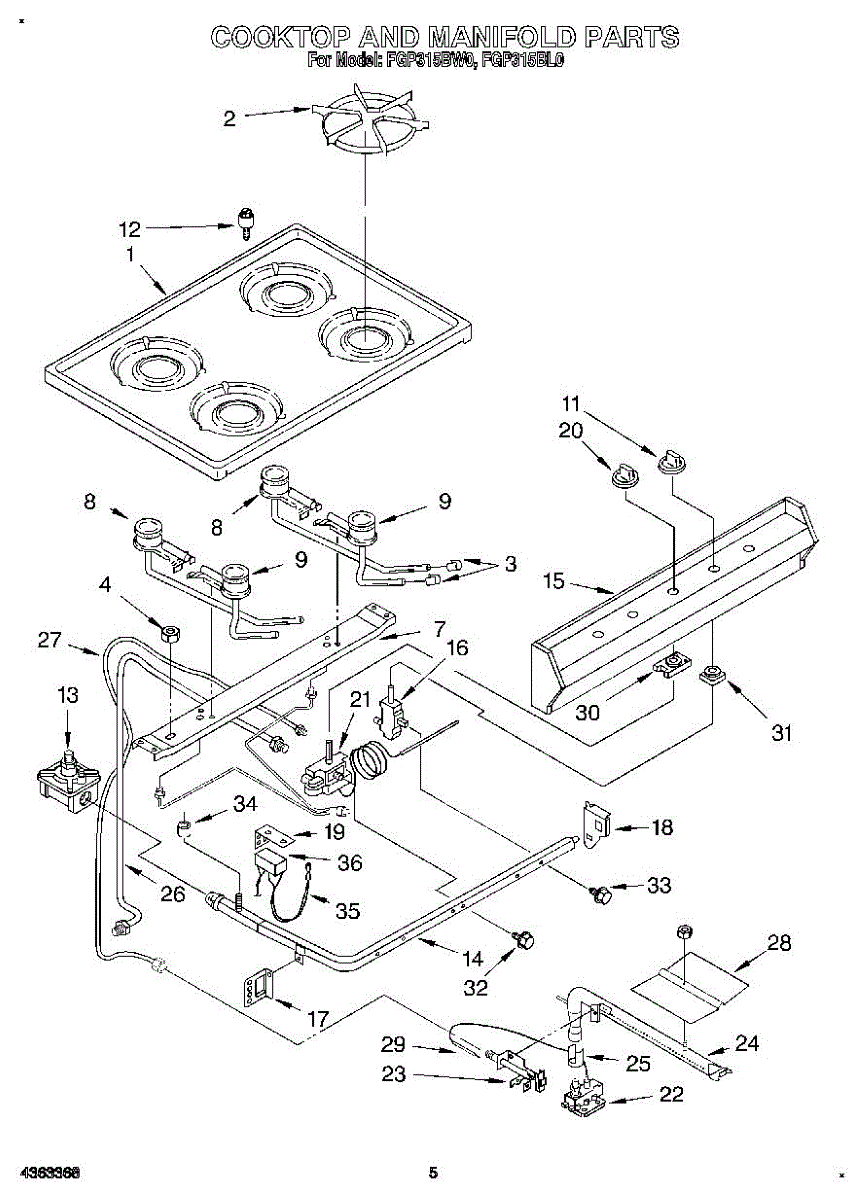 Parts for Roper FGP315BW0: 04 - Cooktop And Manifold, Lit / Optional Parts