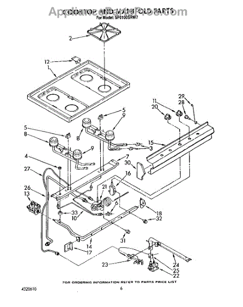 Parts for Whirlpool SF0100SRW7: 05 - Cooktop And Manifold, Lit / Optional Parts
