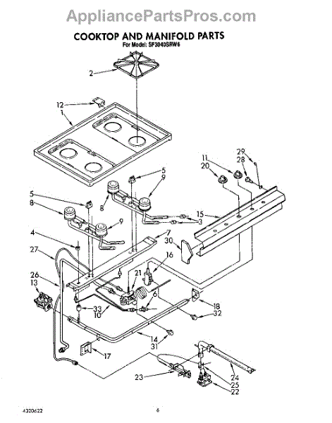 Parts for Whirlpool SF3040SRW6: 05 - Cooktop And Manifold, Lit / Optional Parts