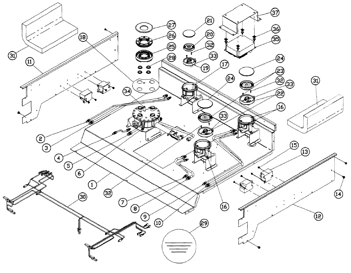 Seals the dual burner assembly to the cooktop surface, preventing spills and ensuring proper support. Replace when worn to restore a snug fit and reliable burner operation. Verify fit with your model number.