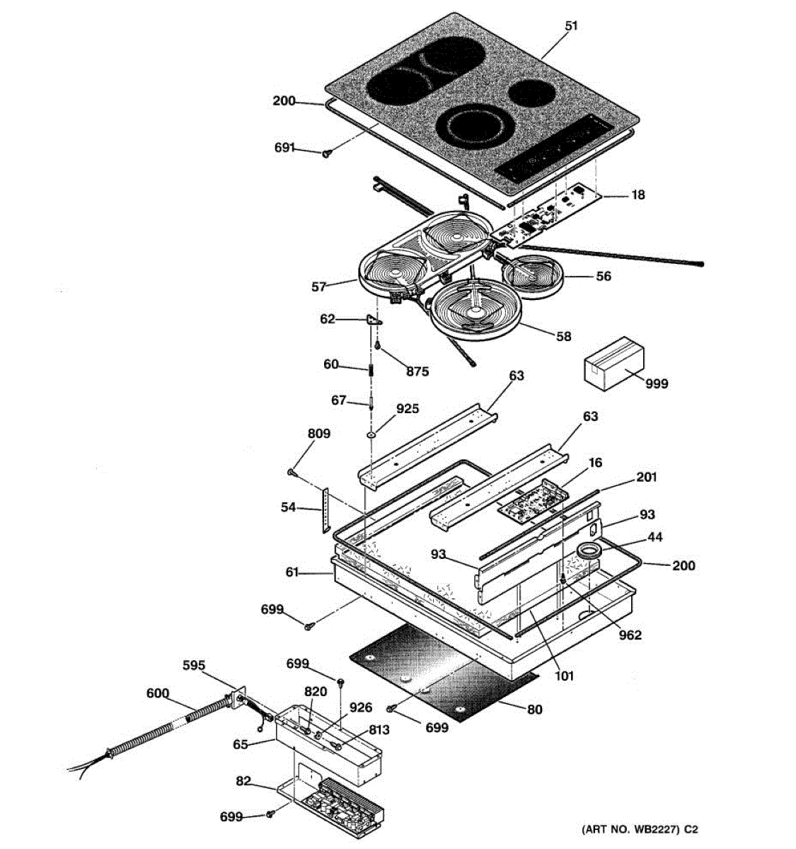 Control harness wire assembly for cooktop. Connects control panel to heating elements. Replace if wires are frayed, damaged, or connections are loose.