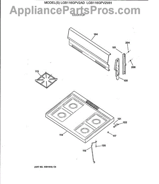 Parts for Ge LGB116GPV2AD: 02 - Cooktop Parts