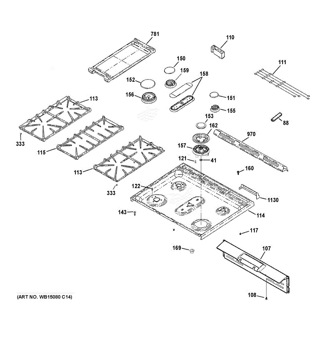 Tri-ring burner assembly for GE gas cooktops. Includes three burners, grates, and brackets. Replace if cracked, warped, bent, or damaged from heat or impact.