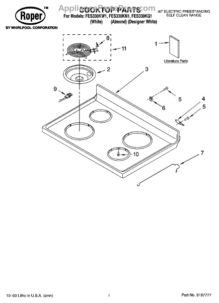 Parts for Roper FES330KW1: 01 - Cooktop Parts