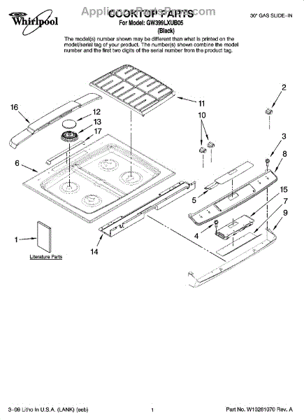 Parts for Whirlpool GW399LXUB05: 01 - Cooktop Parts