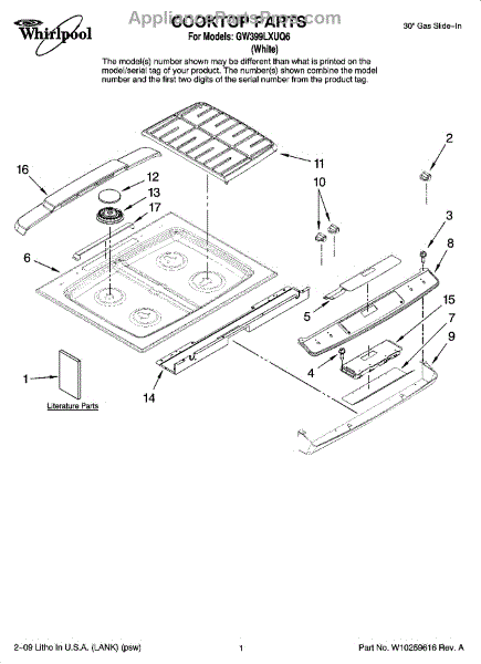 Parts for Whirlpool GW399LXUQ6: 01 - Cooktop Parts