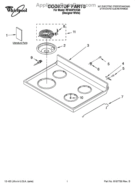 Parts for Whirlpool RF303PXKQ0: 01 - Cooktop Parts