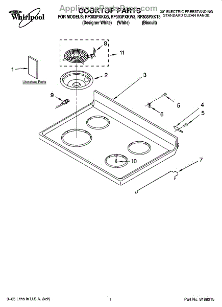 Parts for Whirlpool RF303PXKT3: 01 - Cooktop Parts