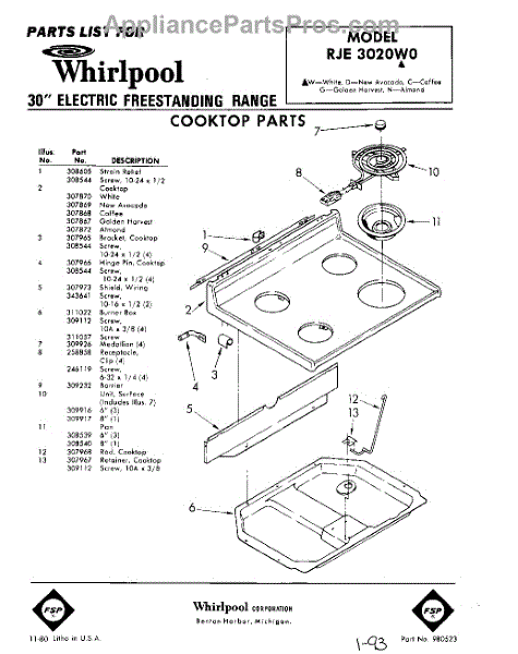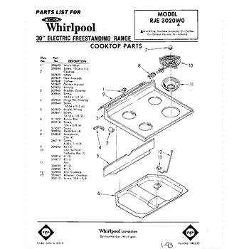 Parts for Whirlpool RJE3020W0: 01 - Cooktop Parts