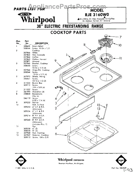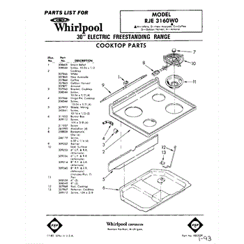 Parts for Whirlpool RJE3160W0: 01 - Cooktop Parts