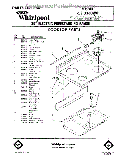Parts for Whirlpool RJE3360W0: 01 - Cooktop Parts