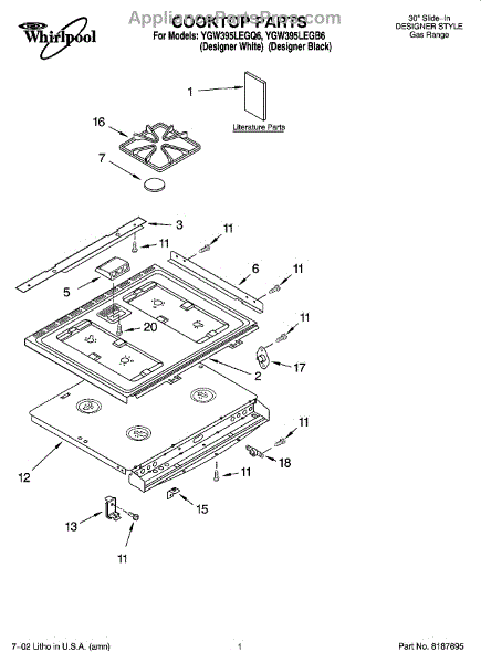 Parts for Whirlpool YGW395LEGQ6: 01 - Cooktop Parts