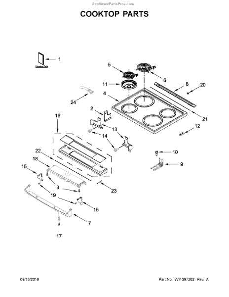 The Stove Top Drip Pan is an OEM replacement part for Whirlpool ranges. It is the shallow metal pan located below the stove burner elements that collect grease and food particles. The drip pan helps direct spills and drips away from the burner area to the bottom drawer for easy cleanup. Symptoms of a bad drip pan include: