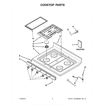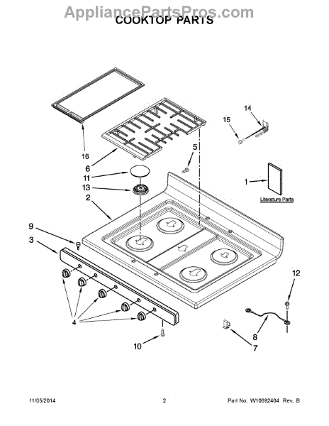 Replacement cooktop top assembly that restores the appliance's cooking surface and provides a secure mounting area for burners, grates and controls. Designed to replace a damaged or worn cooktop top on compatible Whirlpool cooktops. What it does: