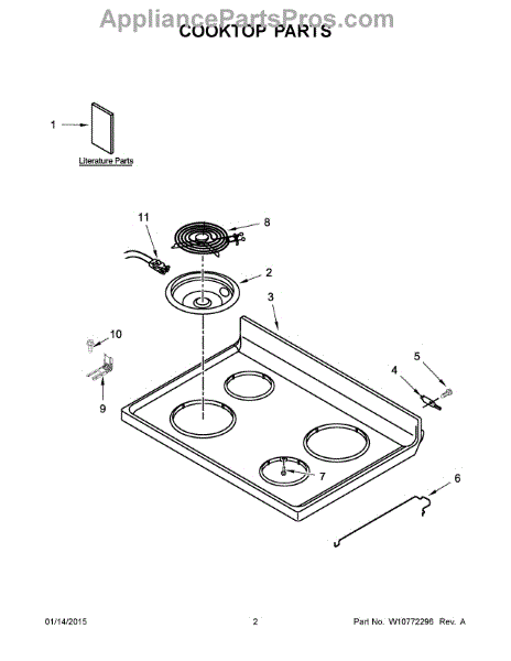 The Stove Top Drip Pan is an OEM replacement part for Whirlpool ranges. It is the shallow metal pan located below the stove burner elements that collect grease and food particles. The drip pan helps direct spills and drips away from the burner area to the bottom drawer for easy cleanup. Symptoms of a bad drip pan include: