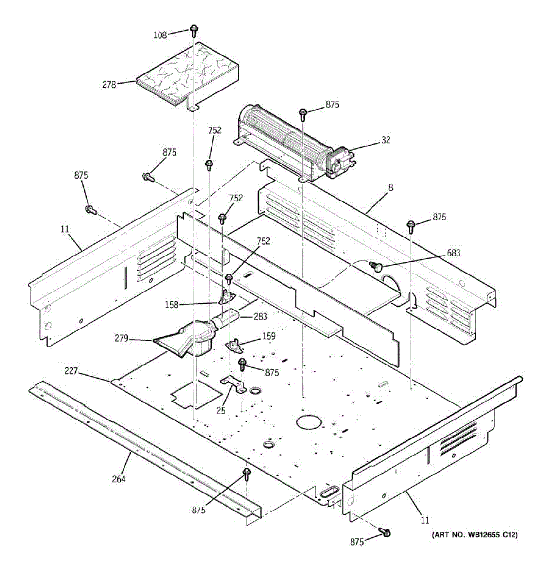 Oven vent box assembly that routes hot air and steam from the cooking cavity. Replace if cracked, damaged, or missing to restore proper ventilation.