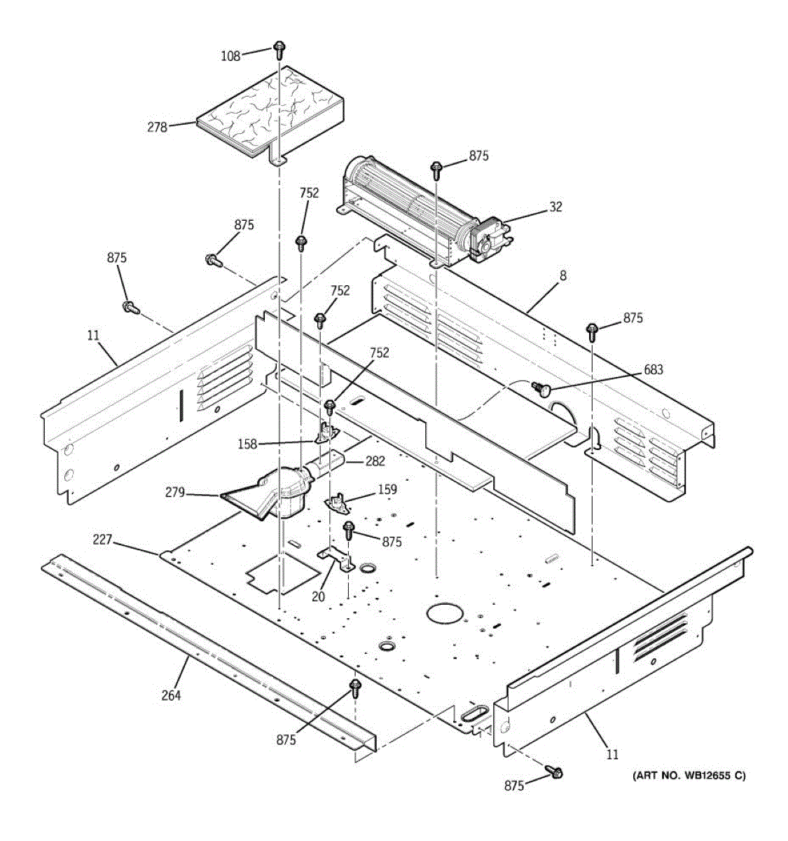Oven vent box assembly that routes hot air and steam from the cooking cavity. Replace if cracked, damaged, or missing to restore proper ventilation.