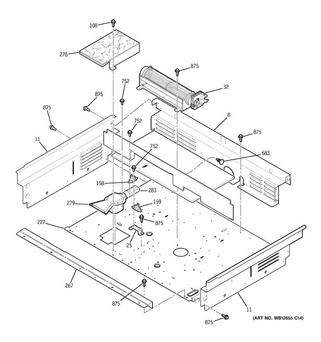 Oven vent box assembly that routes hot air and steam from the cooking cavity. Replace if cracked, damaged, or missing to restore proper ventilation.