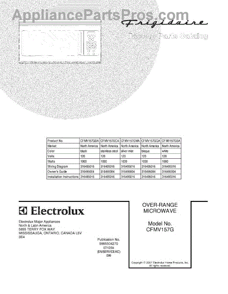 Parts for Frigidaire CFMV157GQA: 01 - Cover Parts